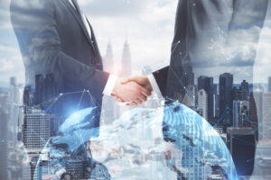 Businessmen shaking hands on bright white city background with globe and polygonal connections. Teamwork and success concept. Double exposure.